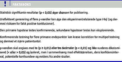 En type I-fejl foreligger, når nulhypotesen »ingen forskel« forkastes, selv om den er sand. En type II-fejl betyder, at man accepterer nulhypotesen til trods for, at der er en sand forskel. Det forhold, at en beslutning til fordel for en falsk behandlingsforskel (type I-fejl) potentielt er mere farlig for patienten, end hvis man holder sig til det etablerede behandlingsregime, selv om der findes et bedre alternativ (type II-fejl), bevirker, at sandsynligheden for at begå en type I-fejl i planlægningsfasen sædvanligvis sættes væsentligt lavere end sandsynligheden for at begå en type II-fejl, f.eks. ved henholdsvis 5% og 20%. Type II-fejlen har betydning for studiets såkaldte styrke (styrke = 1 - sandsynligheden for type II-fejl), hvilket er sandsynligheden for at forkaste nulhypotesen til fordel for en sand alternativ hypotese før eksperimentet. Styrken afhænger af stikprøvens størrelse, baseres på test af en enkelt hypotese og sættes sædvanligvis til 80%. p-værdien er sandsynligheden for at opnå de resultater, som ses i undersøgelsen (eller endnu mere ekstreme værdier til fordel for den alternative hypotese), hvis nulhypotesen er sand. Hvis p-værdien er under signifikansgrænsen α = 0,05 (eller 5%), konkluderes det, at der er statistisk signifikans. p-værdien siger intet om, hvor sandsynlig nulhypotesen er [3]. Hvad mere er, den fortæller ikke noget om størrelsen af den pågældende behandlingseffekt, ej heller noget om dens kliniske værdi. Derfor er brugen af ledsagende konfidensintervaller altid på sin plads [4].