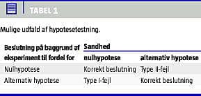 Da direkte verifikation af hypoteser er umulig, baseres hypotesetestning på princippet om falsifikation [2]. Hertil kræves to hypoteser: en nulhypotese og en alternativ hypotese. Sidstnævnte er den originale forskningshypotese, mens den komplementære nulhypotese repræsenterer »nul difference«. Hvis man f.eks. sammenligner ny og gammel behandling, indikerer nulhypotesen »ingen forskel i behandlingseffekt«, hvorimod den alternative hypotese lyder: »Der er en forskel i behandlingseffekt«. En af hypoteserne er sand, men vi ved ikke hvilken. Resultatet af forsøget kalder på en beslutning til fordel for en af hypoteserne. Der er fire mulige udfald: to beslutninger er korrekte, to er ukorrekte. De repræsenterer henholdsvis type I- og type II-fejl (Tabel 1 ).
