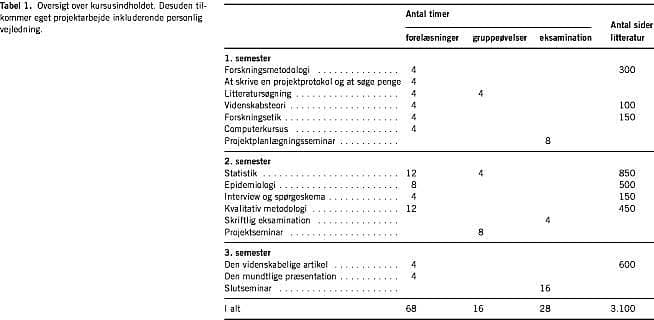 Diskussion: Kurset udgør et vigtigt erfaringsmateriale i forbindelse med indførelsen af den nye speciallægeuddannelse i Danmark, hvor alle læger skal gennemføre en specialespecifik forskningstræning svarende til 60 dage indeholdende forskningsmetodologi og projektarbejde under vejledning. Almen medicin har udarbejdet sit forslag til forskningstræning ud fra erfaringerne med disse kurser, og forslaget indgår i målbeskrivelsen i Almen Medicin vedrørende akademikerrollen [1].