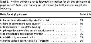 Det almindeligst givne motiv for at gå på kurset var ønsket om at lære kritisk gennemlæsning af videnskabelige studier respektive at lære at gennemføre egne studier (Tabel 2 ).