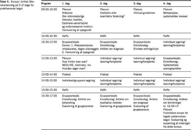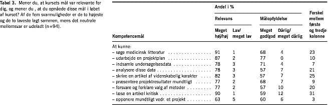 Det kompetencemål, som viste størst difference mellem relevans og målopfyldelse var »at læse en artikel kritisk« (31%). Derfor har vi i Danmark udviklet et firedageskursus i kritisk litteraturlæsning, som tilbydes alle praktiserende læger som supplement til kurset i grundlæggende forskningsmetodologi (Tabel 4 ).