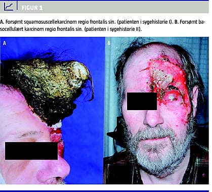 II. En 58-årig mand med behandlingsrefraktær depression fik fjernet en hudforandring i venstre øjenbryn. En efterfølgende histologisk undersøgelse bekræftede diagnosen BCC. Patienten udeblev fra dermatologisk kontrol efter en måned og blev ikke set af en læge før ni år senere. Forandringen havde i mellemtiden udviklet sig, hvorfor han blev henvist til præoperativ vurdering, men udeblev igen. I årene herefter blev han tiltagende socialt isoleret uden kontakt til familie, venner eller sundhedsvæsen. Yderligere ni år senere blev patienten indlagt på en psykiatrisk afdeling pga. forværring af depressionen. Herfra blev han henvist til Rigshospitalet. En ny biopsi viste fortsat BCC og en efterfølgende magnetisk resonans-skanning viste tumorindvækst i venstre sinus frontalis, orbita, øje og i dura mater. Det blev vurderet, at patienten var inoperabel, og han indvilligede i palliativ strålebehandling (Figur 1B).