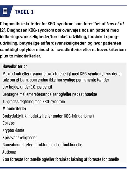KBG-syndrom kan være en hyppigere forekommende årsag til genetisk betinget psykomotorisk forsinket udvikling end antallet af kendte patienter med syndromet afspejler [2]. Med denne sygehistorie gør vi opmærksom på et genkendeligt syndrom, så børnelæger, klinisk genetikere og andre kan have diagnosen med i overvejelserne ved udredning af et barn med indlærings- og adfærdsvanskeligheder.