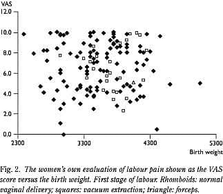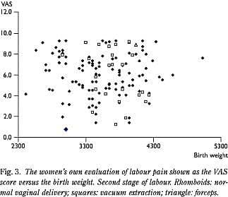 Resultater: VAS-værdien i »syfasen« var signifikant lavere end i de øvrige faser. Der var ingen sammenhæng mellem VAS-værdi og moderens alder, BMI, højde, vægt eller behov for instrumentel forløsning. I intervallet 2.400-5.050 gram fandtes ingen sammenhæng mellem VAS-værdi og fødselsvægt. Der var ikke signifikant forskel på fødselsvægt hos kvinder, som havde behov for epiduralblokade, sammenlignet med kvinder, som ikke havde behov for dette.