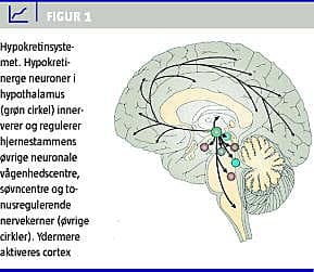 Narkolepsi har gennem de seneste 100 år været omspundet af mystik pga. de tilsyneladende mærkværdige symptomer. Sygdommen er udtalt invaliderende [2], da patienterne udvikler søvnighed med søvnanfald, anfald af muskelsvaghed og hallucinationer. Søvnen præges af mange bevægelser, talrige opvågninger og hurtigt indsættende REM-søvn. For ti år siden fandtes, at narkolepsipatienter har selektiv destruktion af neuroner i den laterale del af hypothalamus, som producerer neuropeptiderne, hypokretin-1 og -2 [3]. Hypokretinsystemet udgør en vigtig del af hjernens centrale regulation af søvn, vågenhed og muskeltonus (Figur 1 ). Manglen på hypokretin kunne således forklare narkolepsisymptomerne [4].