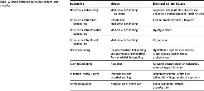 Tabel 1 viser en oversigt over føtale behandlingskrævende tilstande og tilhørende behandlingsmetoder.