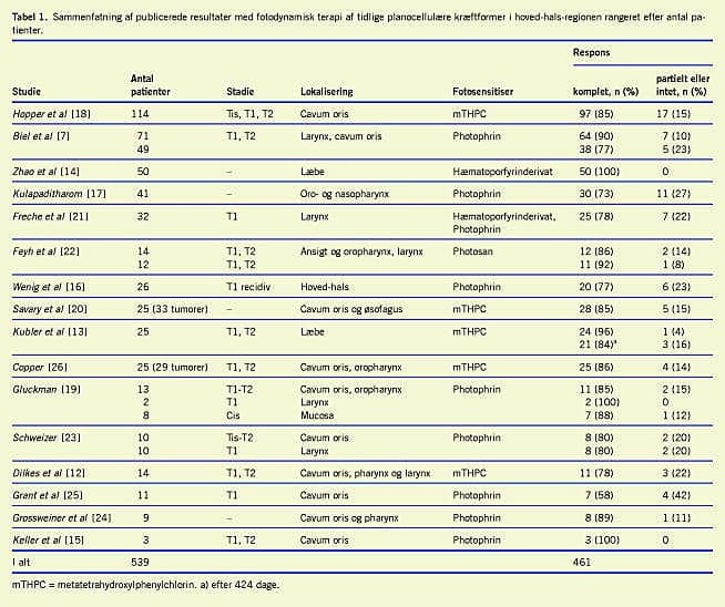 I Tabel 1 sammenfattes resultaterne fra publikationer om PDT som kurativt intenderet behandling af hoved-hals-kræft i tidligt stadie (carcinoma in situ, T1 (≤ 2 cm) og T2 (2-4 cm) tumorer) [7, 12-26]. Det drejer sig udelukkende om ikkerandomiserede fase II-undersøgelser. I alt 539 patienter er blevet behandlet, og der er opnået komplet respons hos 85% efter en behandling. Den største undersøgelse publiceredes i 2004 som en åben ikkerandomiseret fase II-undersøgelse [19]. I alt 114 patienter gennemførte protokollen, og 97 (85%) opnåede komplet respons, mens 77% fortsat var i remission efter henholdsvis et og to år. Et- og toårsoverlevelsen var på henholdsvis 89% og 75%. Varigheden af komplet respons var gennemsnitlig > 619 dage (medianen endnu ikke nået). De funktionelle og kosmetiske resultater beskrives som meget tilfredsstillende. Bivirkninger i form af smerter (milde til moderate) rapporteredes hos 82% af patienterne, men kunne behandles med analgetika. Endvidere var der hudforbrændinger (førstegrads) hos 13% af patienterne.