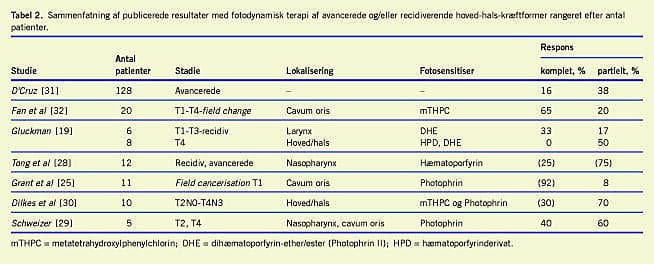 For avancerede hoved-hals-tumorer er der udført adskillige undersøgelser. I de første undersøgelser blev der benyttet Photophrin som fotosensitiser, hvor lyspenetrationen i vævet er begrænset. Behandlingen medførte kun kortvarigt partielt respons efterfulgt af tumorprogression. De nye andengenerationsfotosensitisere giver bedre resultater. I Tabel 2 vises udvalgte kliniske forsøg med første- og andengenerationsfotosensitisers [19, 25, 28-32]. Alle er ikke randomiserede fase II-undersøgelser. Den største af disse undersøgelser omfattede 128 patienter, der havde avanceret inkurabel hoved-hals-kræft og var blevet behandlet med mTHPC-PDT [31]. En måned efter behandlingen var der komplet respons hos 16% og partielt respons hos 38%. Den mediane overlevelse for patienter med komplet respons var > 337 dage sammenlignet med 216 dage for patienter uden komplet respons. Etårsoverlevelsen var 73% for patienter med komplet respons og 32% for patienter uden komplet respons. For komplet tumorrespons var den mediane varighed 84 dage, gennemsnitligt 145 dage. Der blev foretaget livskvalitetsundersøgelse med University of Washington Quality of Life Questionnaire [33], hvorved der blev påvist en forbedring hos 53%.