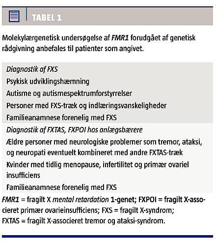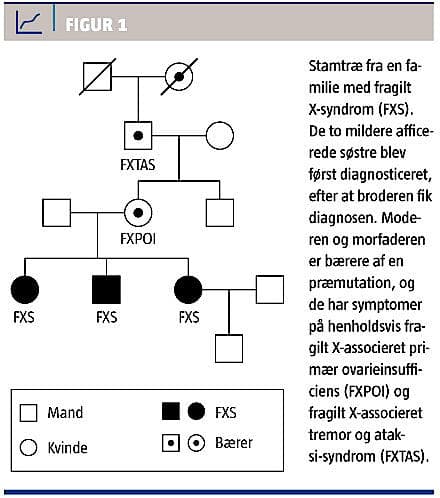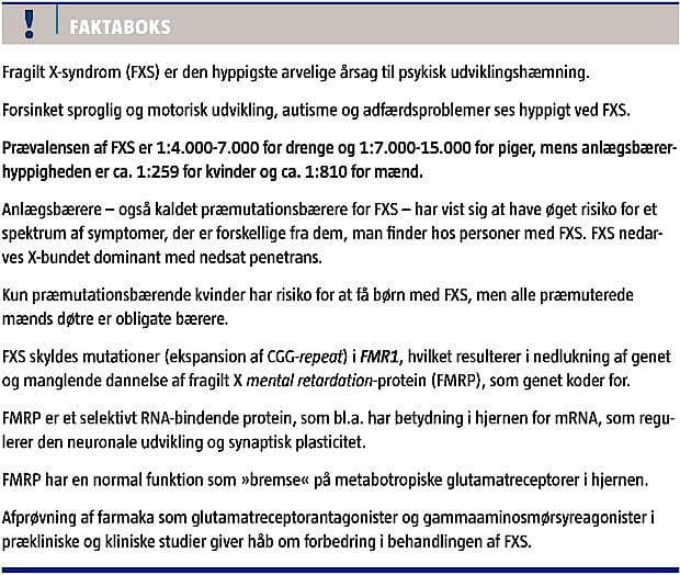 I 1943 beskrev lægerne Martin & Bell en stor familie med X-bundet mental retardering [1]. Det skulle senere vise sig at dreje sig om det, vi i dag kender som fragilt X-syndrom (FXS), der er den hyppigste arvelige form for psykisk udviklingshæmning [2]. Diagnosen var i mange år baseret på forekomsten af en særlig konstriktion eller fragile site på X-kromosomet observeret ved cytogenetisk analyse af Lubs i 1969 [3].