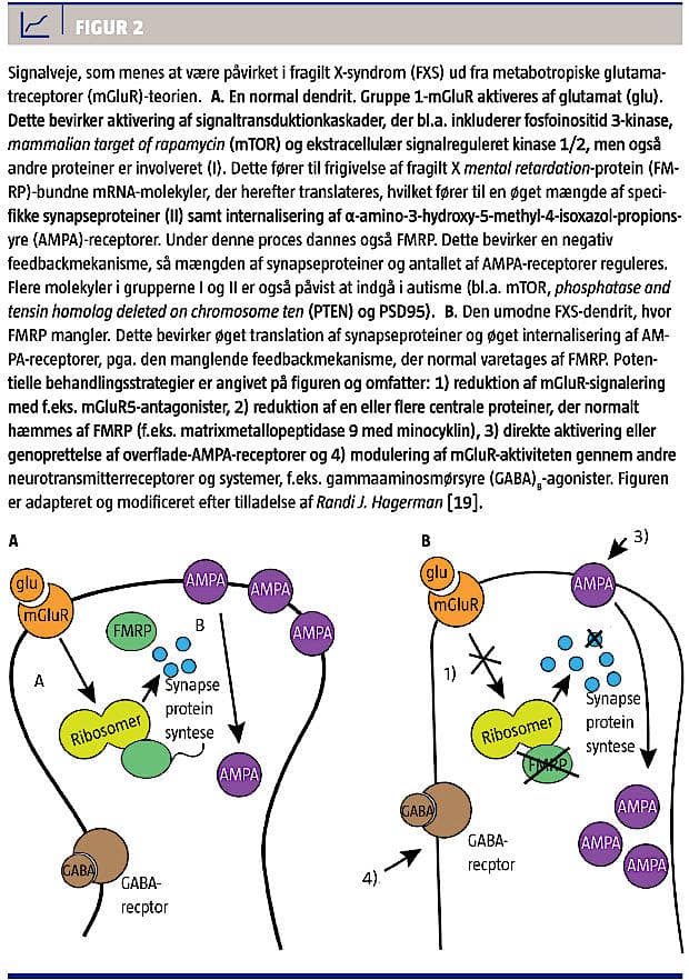 FMRP udtrykkes særligt i centralnervesystemet og testes. FMRP er et RNA-bindende protein, der regulerer translationen af andre gener ved synapserne. FMRP interagerer med en række proteiner samt med flere mikro-RNA’er og spiller derved en afgørende rolle i reguleringen af synaptisk plasticitet, transport, stabilitet og translation af specifikke mRNA’er [22-24]. Mangel på FMRP fører til øget translation af FMRP-bundne transkripter, hvilket indikerer, at FMRP normalt er en translationshæmmer. Ud fra in vitro-screeninger skønnes FMRP at være associeret med op til 4% af alle mRNA’er i hjernen [24]. Af stor vigtighed er FMRP’s regulering af gruppe 1-metabotropiske glutamatreceptorer, der omfatter mGluR1 og mGluR5 [25]. Ved FXS, hvor FMRP mangler, medfører øget aktivitet af gruppe 1-mGluR-receptorer en excessiv proteinsyntese og dermed øget synapseaktivitet (Figur 2A). FMRP fungerer således normalt som »bremse« på mGluR-receptorer [25].