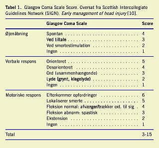 Direkte og hurtig transport af patienter med alvorlige hovedskader til et level- 1 traumecenter med neurokirurgisk og neurointensiv behandling er afgørende for overlevelse og funktionsniveau [1-7]. I en ældre undersøgelse har man påvist, at kirurgisk intervention ved subduralt hæmatom inden for fire timer reducerede dødeligheden [7]. Retningslinjer for visitation af patienter med hovedskader, med fokus på moderate og mindre hovedskader, er udarbejdet af The Scandinavian Neurotrauma Committee [8]. Udgangspunktet for visitation er sværhedsgraden, vurderet ud fra en modificeret Head Injury Severity Scale (HISS) [8, 9]. HISS er baseret på Glasgow Coma Scale score (GCS) [10] varighed af evt. bevidstløshed og evt. fokale neurologiske udfald. GCS er vist i Tabel 1 og HISS i den modificerede form i Tabel 2 .