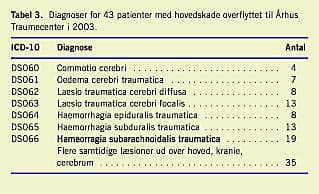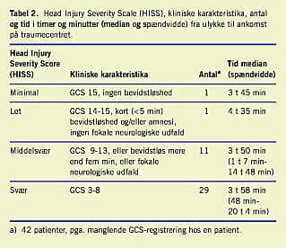 I 2003 blev 89 patienter fra 20 forskellige sygehuse i syv amter overflyttet til Århus Traumecenter. Af disse blev 62 patienter visiteret til neurokirurgisk afdeling fra traumemodtagelsen, 19 patienter blev ekskluderet pga. læsion af columna uden hovedskade. I alt indgik 43 patienter med cerebrale læsioner i undersøgelsen. I fire tilfælde kunne Falck ikke oplyse ulykkestidspunktet, og i stedet anvendtes oplysninger fra Traumecentrets patientjournal. Det lykkedes kun at fremskaffe 25 af i alt 43 ambulancejournaler, hvorfor oplysninger herfra ikke blev anvendt. For en patient fandtes ikke oplysninger om GCS på primærsygehus, og patienten blev derfor ikke inkluderet i resultater for GCS og HISS. Gennemsnitsalderen var 38,6 år (spændvidde 10-76 år). Der var 81% (35 ud af 43) mænd og 19% (8 ud af 43) kvinder. GCS var 6,5 (3-15), og 69% af patienterne (29 ud af 42) havde GCS < 9. I alt 95% (40 ud af 42) af patienterne havde svær til middelsvær hjerneskade vurderet efter HISS (Tabel 2). I alt 93% (40 ud af 43) havde fået foretaget CT-skanning på primærsygehus, og 90% (39 ud af 43) blev intuberet før ankomsten til Århus Traumecenter.