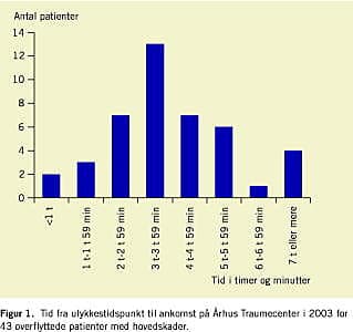 Som hovedregel bringes traumepatienter i Danmark til nærmeste sygehus, hvorfra de overflyttes til et traumecenter, evt. forudgået af en overflytning til et andet, større sygehus mhp. Computertomografi (CT). Der er neurokirurgiske afdelinger på de fire level- 1 traumecentre: Århus Sygehus og Aalborg Sygehus, (begge Århus Universitetshospital), Odense Universitetshospital, Rigshospitalet [11] og Københavns Amtssygehus i Glostrup. Med de relativt korte afstande i Danmark må det forventes, at tidsforløbet fra ulykke til ankomst på et traumecenter er kort. Der foreligger ingen danske undersøgelser af tidsforløbet for patienter med hovedskader, og der er således ingen dansk referenceværdi. Formålet med denne undersøgelse var at beskrive tidsforløbet fra ulykke til ankomst på Århus Traumecenter for patienter med hovedskade overflyttet fra andet sygehus til traumemodtagelsen i 2003.