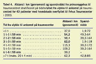 Tiden fra ulykke til ankomst på Traumecentret i Århus for overflyttede patienter med hovedskader var lang. Mediantiden var tre timer og 50 min med stor spændvidde; fra 44 min til 20 timer og fire min - på trods af relativt korte afstande, varierende fra 1,9 km til 172 km, fra primærsygehus til Traumecentret. Det er ikke i overensstemmelse med anbefalinger på området [1, 3, 8].