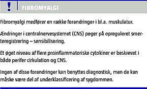 Summary Physiological changes in fibromyalgia Ugeskr Læger 2010;172(24):1830-1832 A number of physiological changes, some measurable as changes in biomarkers, have been described in fibromyalgia (FM). These include changes in cytokine serum levels and elevated levels of some neurotransmitters in the cerebrospinal fluid. None of these measurements have been validated for diagnosis or follow-up in FM. It is suggested that non-invasive methods which hold the potential to evaluate the severity of FM and serve as therapy targets should be developed in the future.6