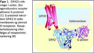 Hormoner virker ved at binde sig til de ekstracellulære dele af receptorerne, som skiftes til en aktiv konformation. Celler har et veludviklet molekylært maskineri til at kontrollere denne receptoraktivitet fra cellens cytoplasma, således at cellen ikke overstimuleres. Således blokeres den aktive konformation, og receptorerne sendes til nedbrydning bl.a. via lysozomer og proteasomet. Denne artikel omhandler de såkaldte G-receptor-kinaser (GRKs), som er blandt de vigtigste enzymer, der slukker for G-protein-koblede receptorer ved fosforylering af receptorernes intracellulære dele [5]. Det er en vigtig pointe, at GRK virker på mange forskellige receptorer som f.eks. adrenerge receptorer og angiotensin II-receptorer. GRKs udgør en famile af receptorkinaser bestående af seks isoformer, hvoraf G-receptor-kinase 2 (GRK2) forekommer i stort set alle celler og derfor er bedst karakteriseret [5-7].