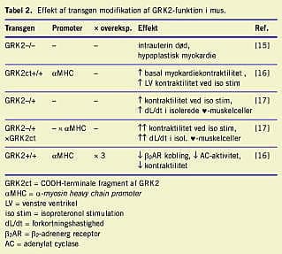 Studier af transgene dyr underbygger ideen om, at GRK2-manipulering kunne blive et nyt princip i fremtidens behandling af hjertesygdomme. Transgene dyr muliggør undersøgelse af et gens funktion ved at eliminere eller øge dets genprodukt, dvs. det protein, som genet koder for. Analyser på transgene dyr, hvor GRK2-niveauet i myokardiet manipuleres, viser, at GRK2 hæmmer myokardiets funktion (Tabel 2 ) [18-20].