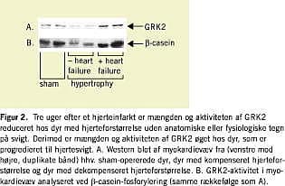 Vore undersøgelser på rotter viser, at GRK2 reguleres i forhold til dyrenes kliniske status efter et eksperimentelt hjerteinfarkt (Figur 2 ) [25, 26], således havde dyr med hjertesvigt et højt GRK2, mens dyr med hjertehypertrofi uden svigt havde et nedsat GRK2-niveau. I dette studie fulgtes dyr med store transmurale infarkter (ved EKKO-kardiografi) i 3-9 uger, hvor myokardiet remodelleredes og forstørredes, og ca. halvdelen af dyrene fik dekompenseret hjertesvigt defineret ved forøget lungevægt. Hos dyr med kompenseret hjerteforstørrelse, var GRK2's mængde og aktivitet reduceret, mens GRK2 var forhøjet hos dyr med dekompenseret hjertesvigt. Årsagerne til korrelationen mellem GRK2 og dyrenes kliniske præsentation kan være flere. Den mest simple udledning er, at forøget GRK2 er en af de molekylære årsager til hjertesvigt, hvilket også stemmer overens med de data fra transgene dyr, som viser, at GRK2-hæmning forbedrer hjertets funktion [18]. Ligeledes er det muligt, at β-blokkeres molekylære effekt i virkeligheden beror på en reduktion af myokardiets GRK2, men dette spørgsmål kan kun afklares ved yderligere undersøgelser.