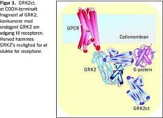 Aktivering af en G-protein-koblet receptor fører til signalering via G-proteinet, som er forankret i cellemembranen (Figur 1). Ved binding til G-proteinet translokeres GRK2-enzymet til cellemembranen, hvor dets target - receptoren - befinder sig. Receptor-fosforylering hæmmer koblingen til G-proteiner, dvs. receptorerne kan nu ikke aktivere flere G-proteiner og signaleringen ophører [5, 9]. Ultimativt fører receptorfosforylering til endocytose, således at antallet af receptorer på cellens overflade falder [10].