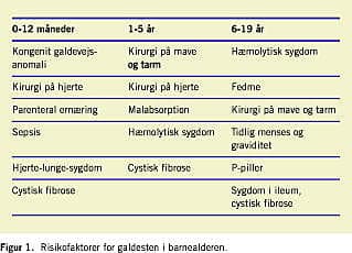 Galdesten påvises hos børn i tre forskellige kliniske situationer: 1) pigmentsten hos småbørn forårsaget af præmaturitet ledsaget af gastrointestinale abnormiteter og langvarig parenteral ernæring, 2) pigmentsten hos børn og teenagere med hæmolytisk sygdom, galdevejsanomalier, cystisk fibrose, parenteral ernæring og sygdom i den terminale ileum, og 3) kolesterolsten hos teenagere med familiær disposition, fedme og p-piller som udløsende faktorer. De vigtigste risikofaktorer på vores breddegrader er opsummeret i Figur 1 .