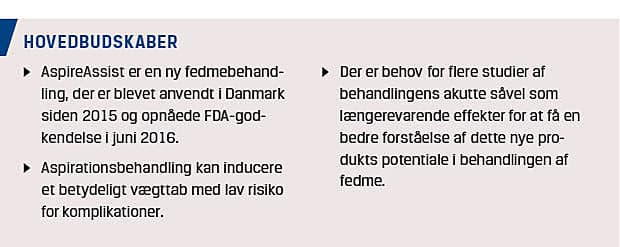 Overvægt og fedme er associeret med en lang række komorbiditeter såsom hypertension, type 2-diabetes samt kardiovaskulære sygdomme og indebærer derfor en stor helbredsrisiko for individet [1]. Trods årtiers forebyggende indsats er prævalensen af fedme steget meget på verdensplan i de seneste årtier og er i dag en stor socioøkonomisk byrde [2, 3]. Man har i flere studier påvist, at livsstilsinterventioner er et effektivt redskab til opnåelse af et initialt vægttab, men at vægttabet typisk remitterer efter ca. et år [4, 5]. Ligeledes er den eksisterende medicinske behandling utilstrækkelig til svært overvægtige personer [6, 7]. Fedmekirurgi har indtil videre givet de bedste resultater for et stort og varigt vægttab (særligt Roux-en-Y-gastrisk bypassoperation (RYGB) og sleeve-gastrektomi), men begge metoder indebærer en risiko for komplikationer [8, 9]. Gastrisk aspirationsbehandling med AspireAssist – også kendt som maveknappen – er en ny endoskopisk vægttabsbehandling, der blev beskrevet for første gang i 2013 [10]. Behandlingen har været tilbudt i privat regi i Danmark siden 2015, men indtil videre har kun få