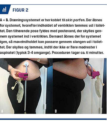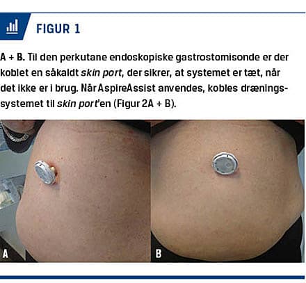 Ved aspirationsbehandling med AspireAssist får overvægtige patienter anlagt en perkutan endoskopisk gastrostomi (PEG)-sonde i ventriklen under gastroskopi og en såkaldt skin port kobles til PEG-sondens udgang (Figur 1). Hele proceduren tager typisk ca. 15 minutter at udføre, og patienten kan komme hjem samme dag. Ca. 20 minutter efter indtagelse af et måltid tilkobles det eksterne dræningssystem (Figur 2). Patienten kan derefter tømme ventriklens indhold postprandialt ved at åbne for systemet og skylle med postevand ind i ventriklen til der ikke længere er madrester i aspiratet. Herved skylles ca. 30% af kalorierne i det indtagne måltid ud i toilettet og optages derfor ikke, hvilket på længere sigt fører til et vægttab [10].