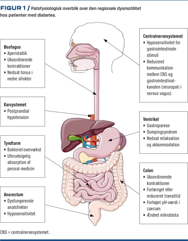 Akut hyperglykæmi hæmmer kontraktionerne i GI-kanalen og sænker tærsklen for kvalme [1, 3]. Kronisk hyperglykæmi medvirker til udvikling af neuropati, hvilket påvirker det autonome (inklusive det enteriske) nervesystem [4]. Diabetisk autonom neuropati er primært en »small-fiber«-neuropati, som rammer de tynde, umyelinerede C-fibre og letmyelinerede Aδ-fibre [5]. I tarmens enteriske nervesystem ses tab af Cajal-celler (pacemakerceller), motorneuroner og inhibitoriske neuroner, som samlet set medfører færre og ukoordinerede kontraktioner samt atrofi af den glatte muskulatur [6]. Neuropati i vagusnerven hæmmer den bidirektionelle signalering mellem centralnervesystemet og GI-kanalen. Endvidere er der påvist central hyposensitivitet for GI-stimuli [7]. Patienter med DM har en lavere pH-værdi i caecum end raske, hvilket formodentlig skyldes øget fermentering og ændret mikrobiota pga. langsom transittid [8]. Tarmens bakterier påvirker både mucosa og signaleringen til hjernen, og det er plausibelt, at ændringer i mikrobiota kan påvirke motilitet og tarmfunktion [9]. Aperistaltik og ukoordinerede kontraktioner i øsofagus ses hyppigt ved DM [10]. I ventriklen ses der ofte reduceret tømningshastighed (gastroparese) eller »funktionelt dumpingsyndrom« med hurtig ventrikeltømning og nedsat postprandial akkommodation [11]. I tyndtarmen og colon ses der ofte en kombination af hyper- og hypomotilitet, der samlet forlænger fødens passagehastighed og disponerer til bakteriel overvækst i tyndtarmen [8]. En dysfungerende analsfinkter og hyposensitivitet i anorectum øger forekomsten af fækalinkontinens [12]. Et patofysiologisk overblik er fremstillet i Figur 1.