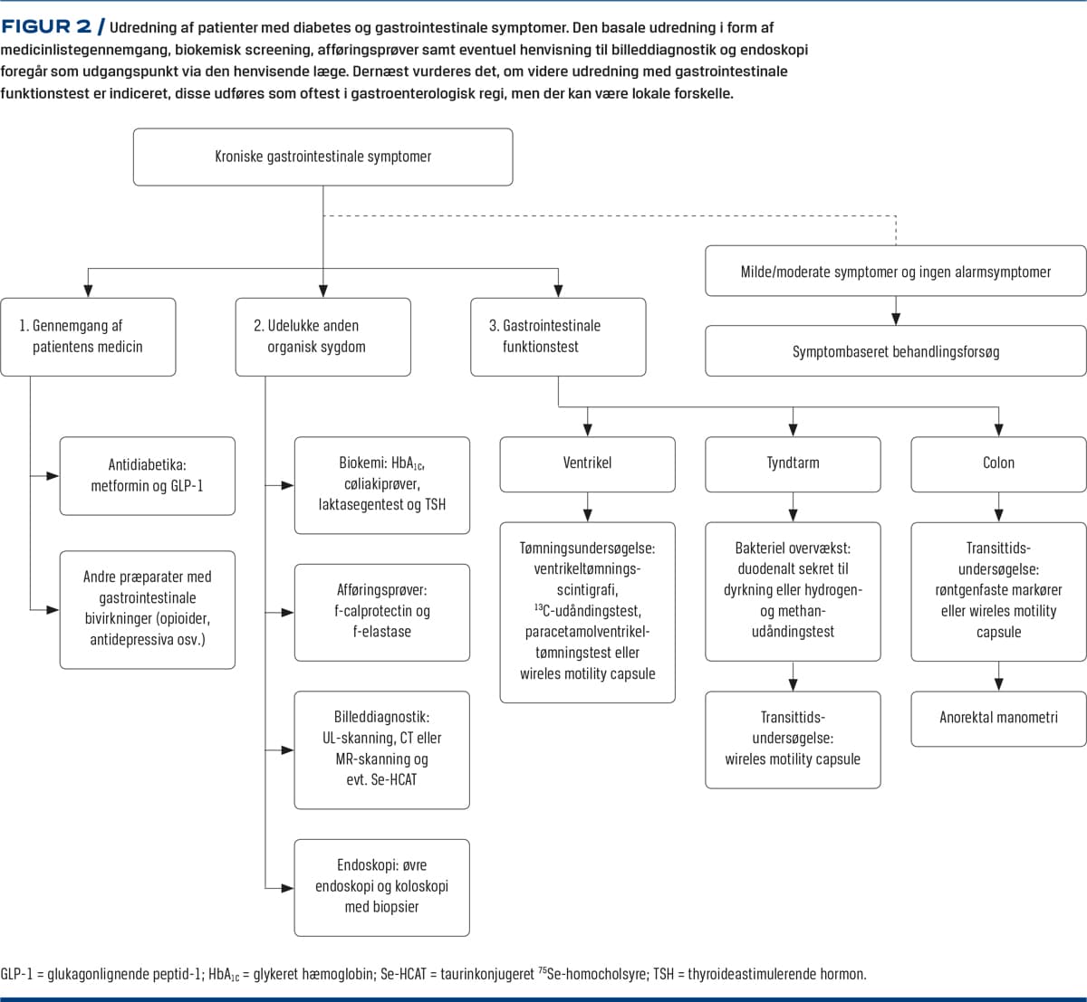 Symptomerne på diabetisk gastroenteropati ligner ofte symptomerne på funktionelle GI-tilstande, der normalt ikke kræver omfattende udredning. Der eksisterer ingen specifik in vivo-test, hvormed man kan afgøre, om GI-symptomer ved DM skyldes diabetisk gastroenteropati. Det er uklart, om standardtest til vurdering af kardiovaskulær autonom neuropati afspejler tilstedeværelsen af GI-neuropati. En beslutning om udredning afhænger primært af symptomernes sværhedsgrad, og udredning af asymptomatiske patienter er oftest ikke indiceret, uanset andre tegn på neuropati. Lang varighed af DM, tilstedeværelsen af senkomplikationer og debut af GI-symptomer adskillige år efter DM-debut taler for, at symptomerne skyldes DM. Tilstedeværelsen af andre mave- og tarmsygdomme kan forveksles med gastroenteropati, og cøliaki, eksokrin pancreasinsufficiens samt flere GI-cancere er overrepræsenterede hos patienter med DM [12]. Afhængigt af symptomatologien er det derfor ofte nødvendigt at foretage gastroskopi, koloskopi med biopsier samt billeddiagnostik i form af enten CT, MR- og/eller UL-skanning af abdomen. Den glykæmiske regulering indgår desuden i vurderingen. Vanlig diarréudredning med cøliakiprøver og laktasegentest samt måling af koncentrationen af thyroideastimulerende hormon, F-calprotectin og F-elastase bør ligeledes indgå. Hos patienter, der har kronisk diarré og ikke responderer på basal behandling, kan skanning med taurinkonjugeret 75Se-homocholsyre for galdesyremalabsorption være indiceret.