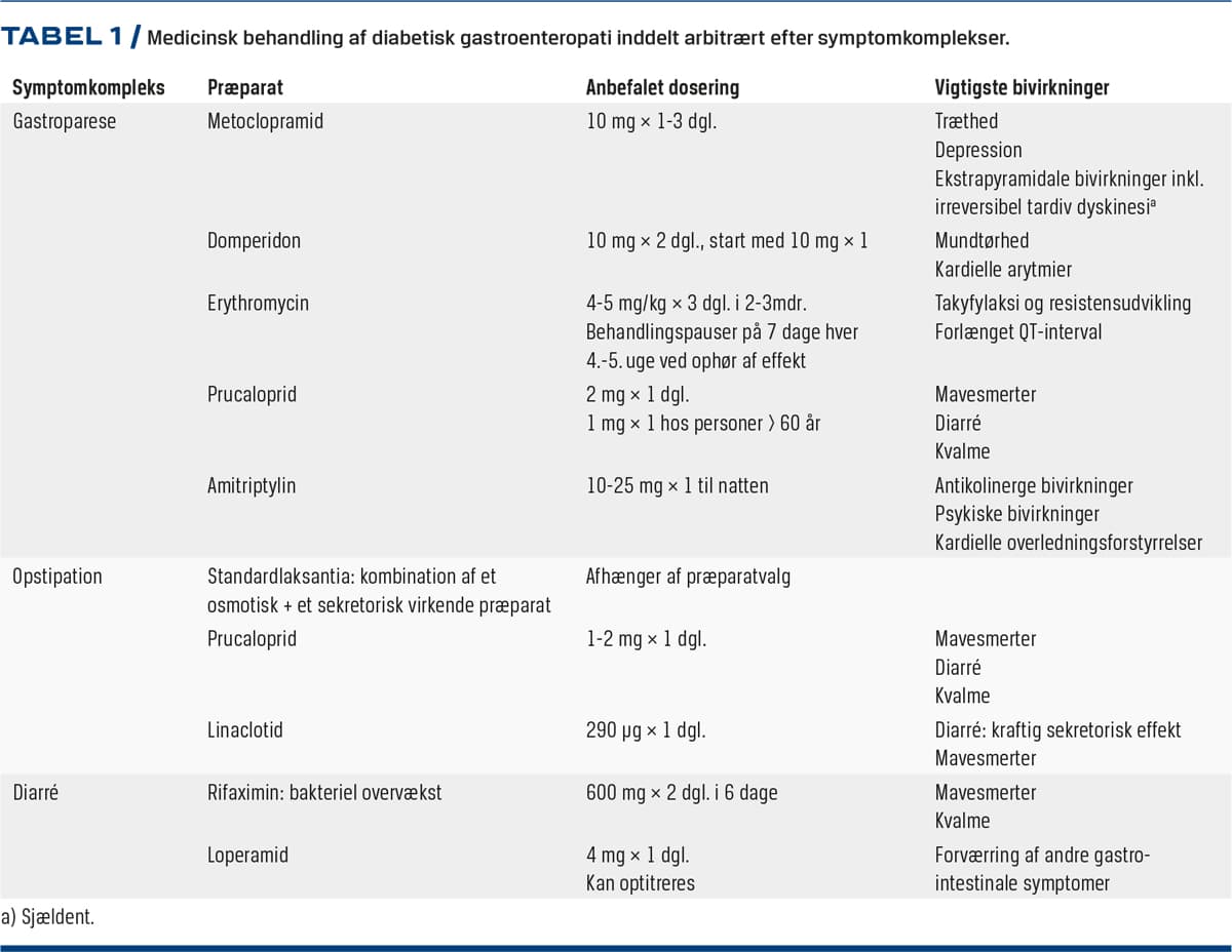 Dopamin-2-receptorantagonisten metoclopramid er førstevalg. Den antidopaminerge virkning medfører ekstrapyramidale bivirkninger hos 0,2%, og hos nogle af disse irreversibel tardiv dyskinesi, hvorfor behandling i mere end 12 uger frarådes [24]. Yderligere 30% får andre centrale bivirkninger, såsom træthed og depression [25]. Domperidon er ligeledes en dopamin-2-receptorantagonist med både prokinetisk og antiemetisk effekt. Præparatet medfører i sjældne tilfælde kardielle arytmier relateret til QT-forlængelse [26]. Makrolidantibiotikaet erythromycin er en motilinreceptoragonist med effekt på ventrikeltømningen. Den kan administreres i flydende form, hvortil der kan søges specielt tilskud, og dosis er oftest den halve af, hvad der gives som antibiotika. Behandlingspauser kan være nødvendige, da længerevarende brug kan medføre takyfylaksi. Prucaloprid er en serotoninagonist, der er indregistreret til brug ved kronisk obstipation. Præparatet øger tillige ventrikeltømningen, hvorfor det af nogle forsøges ved kvalme og opkastninger samt ved kombineret forstoppelse og gastroparese [25]. Ghrelinrecepteragonister såsom relamorelin og ulimorelin er under udvikling mod gastroparese, men resultaterne er ikke entydige [22]. Ved funktionel dumping tilrådes mange, små og let passable måltider. I Tabel 1 ses den medicinske behandling inddelt efter symptomer.