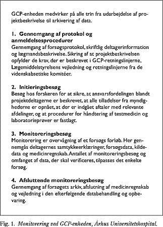 Ved Århus Universitetshospital har man som det første sted i Danmark valgt at oprette en central GCP-enhed (3). Da man i andre dele af landet meget hurtigt skal have afklaret, hvordan man ønsker at leve op til GCP-direktivet, kan det være af interesse at beskrive erfaringerne fra Århus-modellen.