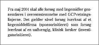 Senest den 1. maj 2004 skal love og bestemmelser, der er affødt af EU, GCP-direktivet (1), være indført. Det betyder, at alle kliniske forsøg med lægemidler fra denne dato skal følge retningslinjerne for god klinisk praksis (GCP) (2). I dag skal GCP-retningslinjerne følges ved klinisk udvikling af nye lægemidler, det vil sige ved de fleste af de forsøg, der initieres af medicinalindustrien. Men fremover skal GCP-reglerne også følges ved alle andre typer af lægemiddelforsøg, det vil sige også ved forsøg, der er initieret af f.eks. en klinisk arbejdende læge eller en ph.d.-studerende.