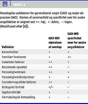 Den kategoriale klassifikation i DSM- og ICD-systemerne placerer depressive lidelser og angsttilstande i forskellige diagnostiske hovedgrupper, og ud fra f orskellige nosologiske validatorer som angivet af Robins & Guze [5], er der begrundelser for at opretholde den nuværende adskillelse af GAD og MD, især behandlingsmæssige, men der er også forhold, især klinisk-fænomenologiske og genetiske, der placerer lidelserne i samme gruppe [6].