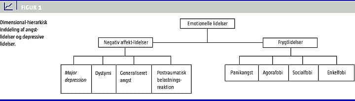 Angst og depression var dog ret upræcist afgrænset i forhold til de diagnostiske systemer i tripartite -modellen, og i efterfølgende forskning forsøgte man at kombinere kategoriale diagnostiske enheder med dimensionelle mål for angst og depression. I 2005 opstillede Watson [12] en dimensional-hierarkisk model med NA som en højordensfaktor, der udtrykker negativ affekt (distress ), og en tilsvarende højordensfrygtfaktor. Som vist i Figur 1 fører det til reklassifikation af GAD, men også til reklassifikation af posttraumatisk belastningsreaktion (PTSD) under negativ affekt-lidelser, altså lidelser, der i højere grad er præget af negativ affekt end af frygtreaktioner. Distress -lidelserne omfatter også dystymi (DD).