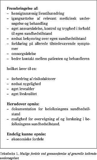 Boks 1 og Boks 2 viser en oversigt over de vigtigste mulige fordele og ulemper, hvis befolkningen tilbydes generelle helbredsundersøgelser. Nogle mulige fordele er allerede nævnt, nemlig den gavnlige effekt på befolkningens somatiske morbiditet og mortalitet som følge af hensigtsmæssige livsstilsændringer og behandling. Der kan desuden opstå nogle hensigtsmæssige psykiske effekter, fx hensigtsmæssige tanker og handlinger i forhold til egen livsstil med øget viden, ansvarsfølelse, kontrol og tryghed hos den enkelte i forhold til sin egen sundhedstilstand. Også en følelse af omsorg fra behandleren/samfundet kan opstå (1, 2). Ved konstatering af sygdom kan den psykiske tilstand bedres ved en forklaring på eventuelle symptomer og igangsættelse af relevant behandling. En helbredsundersøgelse evt. efterfulgt af en længerevarende helbredssamtale kan øge behandlerens og patientens kendskab til hinanden med mulige positive konsekvenser for flere forskellige forhold, herunder dannelse af et solidt fundament for den kontinuerlige behandling, der foregår i almen praksis. Dertil kommer, at en kortlægning af befolkningens sundhedstilstand ville give mulighed for at overvåge denne og desuden skabe et fortrinligt datamateriale for fremtidig forskning. Økonomiske gevinster kan ikke udelukkes.