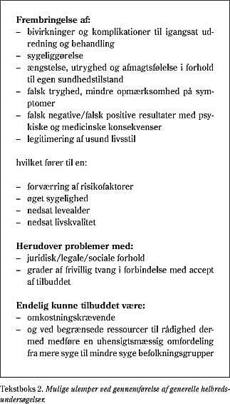 Af mulige ulemper må nævnes risikoen for bivirkninger og komplikationer ved behandlinger eller undersøgelser, som en påvisning af risikofaktorer eller patologiske fund ved helbredsundersøgelsen kan indicere. Dette er særlig problematisk, hvis videreudredningen baserer sig på et falsk positivt resultat. Konstatering af uerkendt sygdom eller sygdomsrisiko kunne medføre en øget sygdomsfølelse i befolk- ningen samt ængstelse, utryghed og afmagtsfølelse hos den enkelte i forhold til sin egen sundhedstilstand. Formidlingen fra lægen til den enkelte person af den eksisterende viden om betydningen af forhøjede risikofaktorer og eventuelle gevinster ved behandling er vanskelig og indebærer et problem i sig selv (3). Falsk tryghed efter normale fund kan måske forsinke diagnosticeringen af sygdom, hvis lægesøgningsadfærden ændres, fx fordi man fejlagtigt tror, at helbredsundersøgelsen er en 100% garanti for, at man er rask. Falsk negative og falsk positive testresultater vil altid være et problem. En uhensigtsmæssig livsstil kan legitimeres af normale fund. Dertil kommer de juridisk/legale og sociale problemer i forhold til en øget afdækning af risikofaktorer og sygdom i befolkningen. For eksempel kunne ansættelses- og forsikringsforhold kompliceres af kendskab til risikofaktorer og sygdomme, som uden gennemførelse af en generel helbredsundersøgelse ville være uerkendte. Nogle vil føle en forpligtelse til at deltage i et screeningstilbud på trods af en manglende lyst til at deltage, ligesom nogle måske slet ikke er klar over, at man kan takke nej. Dette stiller særlige krav til informationen omkring screeningstilbuddet. Gennemførelse af generelle helbredsundersøgelser kan være omkostningskrævende.