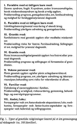 Megen rådgivning er rettet til forældre til et barn med en specifik genetisk sygdom. Forældrene ønsker at få viden om risikoen for, at kommende børn bliver ramt af sygdommen, samt om muligheder for forebyggelse. I andre tilfælde er de rådsøgende et par, som påtænker at få børn, og hvor der i den enes familie forekommer en genetisk sygdom. Fætter-kusine-ægteskaber kan også være et muligt genetisk problem. Genetisk rådgivning ydes endvidere i forbindelse med fosterdiagnostik hos gravide med øget risiko, både før en evt. moderkageprøve/fostervandsprøve og i forbindelse med resultatet. Med kortlægningen af menneskets arvemasse er der kommet nye muligheder for prædiktiv testning af sent debuterende sygdomme, f.eks. neurologiske sygdomme og visse arvelige cancersygdomme. Her ønsker de raske rådsøgende en vurdering af risikoen for selv at udvikle sygdommen, herunder måske en gentestning (Fig. 1 og Fig. 2 ).