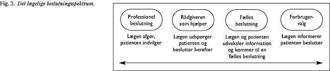 Det almindelige læge-patient-forhold har langsomt bevæget sig fra en paternalistisk model hen mod en ligeværdig »partner«-model, hvor lægen stiller sin medicinske viden til rådighed i en dialog, som inddrager patientens ønsker, værdier og holdninger for at nå en fælles beslutning. På en skala fra »doktoren ved bedst« til »patienten som forbruger« (Fig. 3 ) ses idealet i mange situationer i dag som den fælles beslutningstagning.