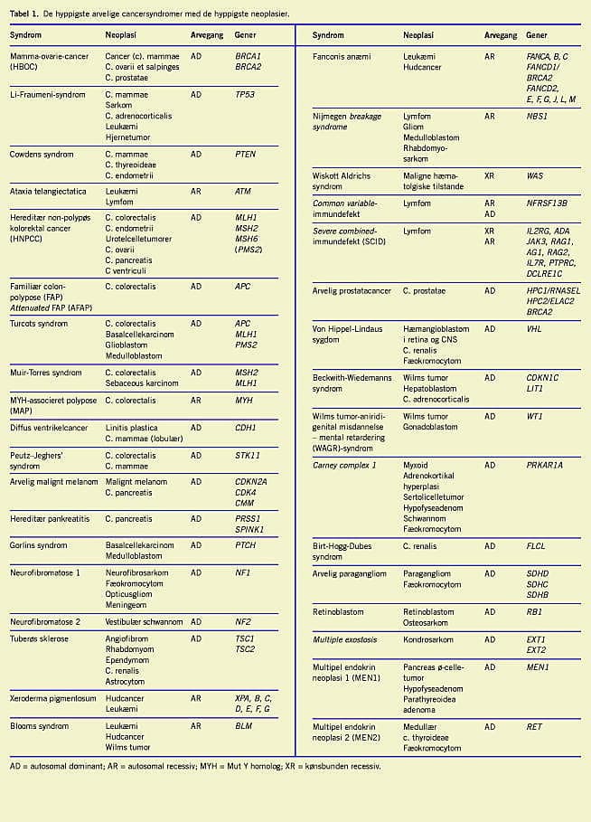 Tabel 1 giver en oversigt over de hyppigste arvelige cancersyndromer, arvegangen og de involverede gener.