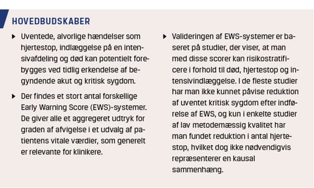 Formålet med denne artikel er at beskrive brugen af EWS og give et overblik over evidensen bag anvendeligheden af EWS som et værktøj til at identificere samt forebygge udvikling af kritisk sygdom og uventet død hos indlagte patienter.