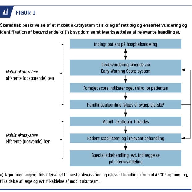 I dag anvendes der forskellige systemer til opsporing og tilsyn af patienter med begyndende kritisk forværring. Systemerne består af en kombination af en systematisk observation med måling af vitalværdier og en tilhørende handlingsalgoritme, Early Warning Score (EWS), samt mobile akutteam (MAT) og personale med erfaring i håndtering af kritisk syge. Samlet kaldes dette mobilt akutsystem (MAS) i Danmark (Figur 1) [3, 4].