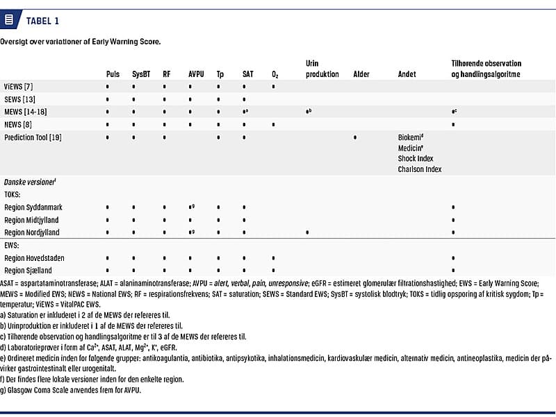 I 2007 satte Dansk Selskab for Patientsikkerhed fokus på håndteringen af den akut syge patient og forebyggelige dødsfald med projektet »Operation life«, der introducerede MAT flere steder. Fuhrmann et al påviste samtidig, at der hos knap halvdelen af de indlagte patienter ikke var målt vitalværdier, som viste sig at være afvigende [9]. Praksis for måling af vitalværdier varierede under indflydelse af den enkeltes viden, erfaringsniveau og muligheder for klinisk refleksion i den daglige praksis [10]. Eksempler på tidlige EWS-systemer i Danmark er »Tidlig opsporing af kritisk sygdom« på Aarhus Universitetshospital og »Bispebjerg Early Warning Score« fra 2009 [11, 12]. Alle regioner har nu indført EWS-systemer til systematisk observation af indlagte patienter, og alle systemerne bygger på principperne fra NEWS, men med lokale forskelle (Tabel 1).