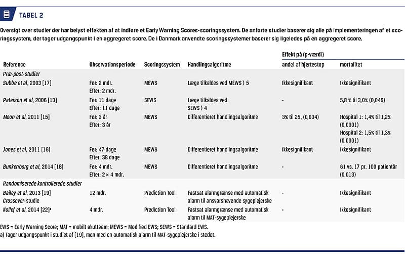 Man har i en række studier søgt at validere EWS ved isoleret at undersøge brugbarheden til at risikostratificere i forhold til død og hjertestop [6, 20], hvorimod betydningen af EWS på effektmålene kun er undersøgt i få studier. Studierne bygger overvejende på data, der er indsamlet før og efter indførelsen af et EWS-system. Et randomiseret studie er gennemført (Tabel 2) [20]. Nedenfor gennemgås relevante studier, hvor man har undersøgt variationer af EWS: VitalpacTM EWS (ViEWS), NEWS, Modified Early Warning Score (MEWS) og Standard Early Warning Score (SEWS) (Tabel 1).