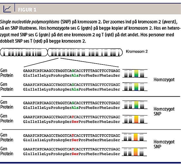 For at 23andMe’s test kan FDA-godkendes, skal der for hver af de 254 sygdomme/sygdomsmarkører og andre tilstande som bærerstatus og lægemiddelfølsomhed foreligge dokumentation af testens kliniske værdi, altså om de svar, der gives, er videnskabeligt begrundede [6]. Hvor nogle genomiske varianter kan klassificeres som sygdomsfremkaldende, kan andre ikke med den nuværende viden om genomisk varians med sikkerhed siges at udgøre en sygdomsrisiko [7]. Det er derfor på ingen måde en let opgave at dokumentere en klinisk relevans af de genetiske risikoprofiler for alle 254 kliniske tilstande. Kompleksiteten øges yderligere af, at celler har to kopier af hvert kromosom, og at SNP’en kan findes enten i det ene kromosom (heterozygot) eller i begge kromosomer (homozygot) (Figur 1).