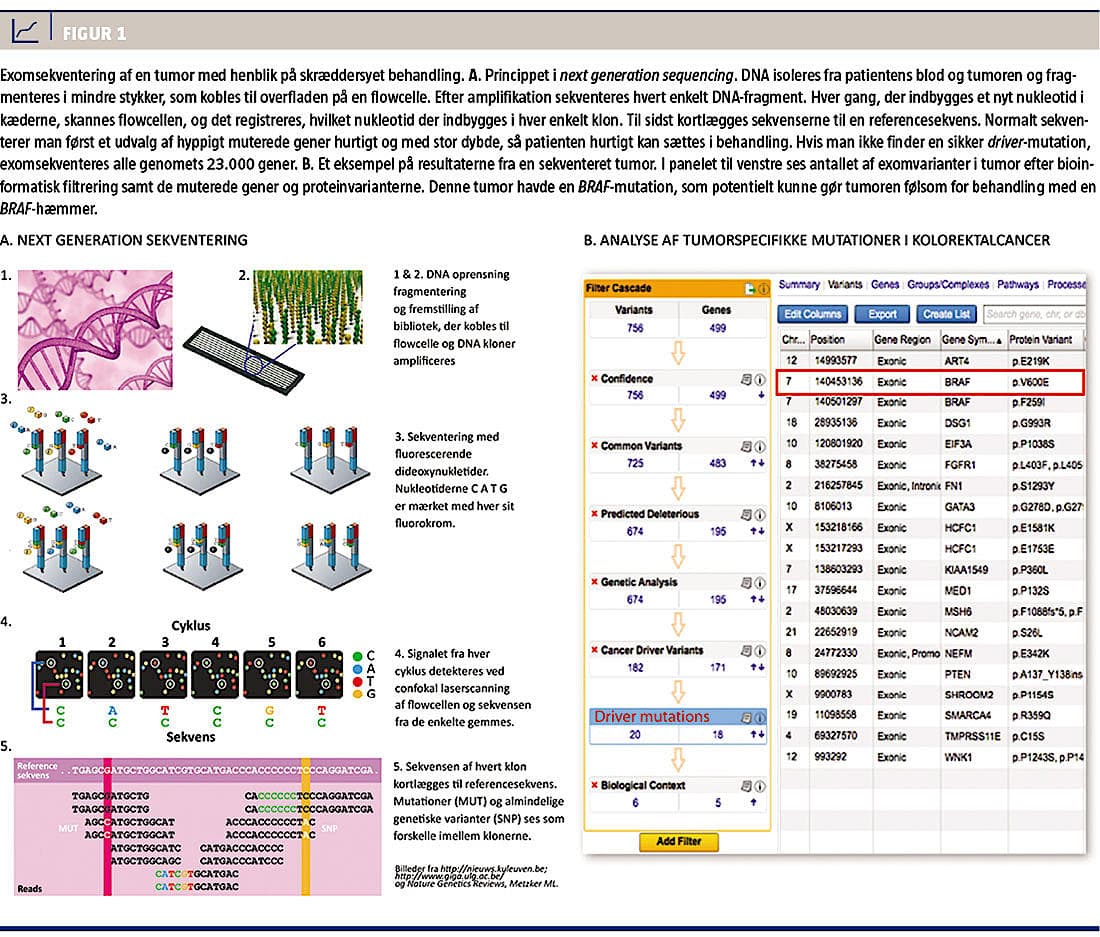 DNA- og RNA-sekventering er en forudsætning for identifikation af genvarianter og sygdomsfremkaldende mutationer, og udviklingen i sekventeringsteknologierne har udviklet det bærende element i genomisk medicin. I starten af 1990’erne kunne man på et laboratorium sekventere få tusinde baser om ugen, hvilket svarede til den kodende del af et lille gen i en enkelt patient. I 2000’erne blev det ved anvendelse af fluorescerende dideoxynukleotider og kapillærelektroforese muligt at tidoble kapaciteten, og molekylærgenetiske analyser af mindre gener blev rutine. Indtil afslutningen af det humane genomprojekt havde man således kun sekventeret et enkelt genom [4], og det var først omkring 2005, hvor man udviklede de første maskiner til massiv parallelsekventering (MPS), at udviklingen tog fart. MPS, som nu betegnes NGS, er baseret på en række forskellige teknologier, hvis fællesnævner er, at genomet fragmenteres i millioner af små stykker DNA, der kobles på en overflade eller indesluttes i små nanopartikler og amplificieres, hvorefter man følger sekventeringen af hver enkelt DNA-klon (Figur 1). Sekvenserne kortlægges og sammenlignes med en kendt referencesekvens. Med den seneste teknologi er det muligt at sekventere et fuldt genom på ca. ti dage eller et exom på nogle få dage (Figur 2).