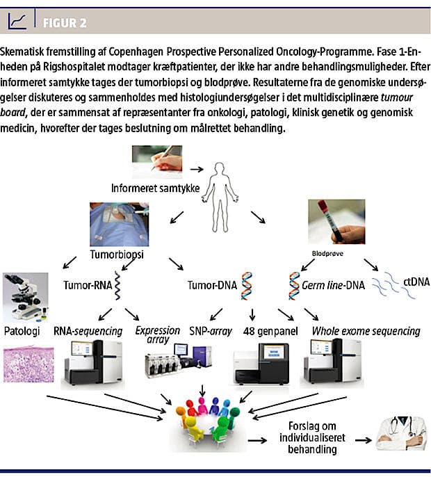 I maj 2013 indførte man på Fase 1-Enheden på Rigshospitalet et personligt genomisk screeningsprogram kaldet Copenhagen Prospective Personalized Oncology (Figur 2). Fase 1-Enheden på Rigshospitalet er en dedikeret eksperimentel klinisk onkologiafdeling, hvor man modtager omkring 200 patienter, der ikke har andre behandlingsmuligheder, fra hele landet. Programmet vil omfatte ca. 500 patienter over en periode på fem år. Målet er at allokere patienter med specifikke genudtryk til fase 1-forsøg med målrettede lægemidler, således at undersøgelsen bliver beriget med de rigtige patienter. Denne form for precision medicine er også indført på flere andre fase 1-enheder i Europa og USA, f.eks. på Institute Gustave-Roussy i Paris og MD Anderson i Houston