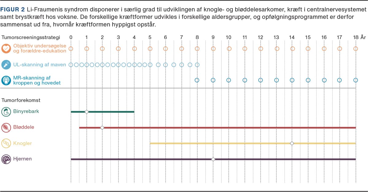 LFS disponerer til mange forskellige kræftformer, og det er derfor nødvendigt at følge patienterne fremadrettet med omfattende screeningsforløb tilrettelagt ud fra, hvornår de forskellige kræftformer typisk opstår (Figur 2). Derigennem håber man at opdage ny kræftsygdom på et tidligt stadie og mindske dødeligheden. Dette underbygges af et tidligere studie, hvor man fandt, at patienter, der havde LFS og havde tilvalgt opfølgning med screeningskontroller, havde en femårsoverlevelse på 88,8% (95% konfidens-interval (KI): 78,7-100) efter diagnostik af primærcancer, mod en femårsoverlevelse på 59,6% (95% KI: 47,2-75,2) hos kontrolgruppen, der havde fravalgt opfølgning. Resultatet skal tages med et vist forbehold, da studiet ikke var et randomiseret kontrolleret forsøg, og det umiddelbart logikstridigt viste, at der var flere tumorer i kontrolgruppen. Trods dette er studiet for nuværende den primære evidens bag screeningstilbud til personer med LFS [5].