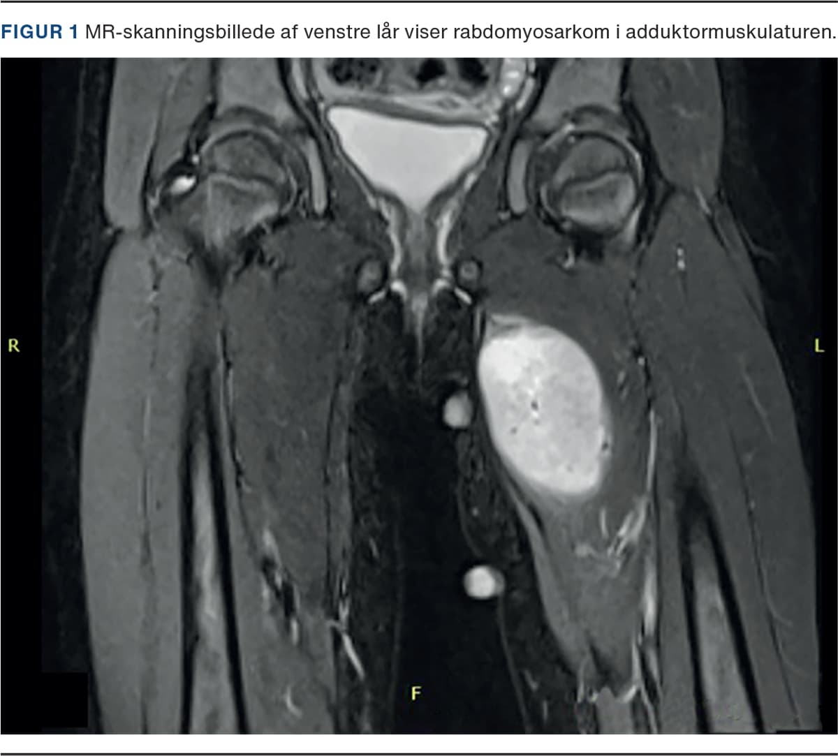 En treårig pige blev henvist til udredning for en knude på venstre lår. Den histologiske undersøgelse gav diagnosen embryonalt rabdomyosarkom. Tumoren målte 5,2 × 4,3 × 3,1 cm, og der var ingen tegn på spredning (Figur 1). Pigen blev behandlet med fire serier neoadjuverende kemoterapi, inden tumoren blev fjernet kirurgisk. Herefter blev hun behandlet med yderligere fem serier kemoterapi og overgik til sidst til 24 ugers konsoliderende kemoterapi. Fire måneder efter operationen viste en MR-skanning ingen tegn på resttumor.