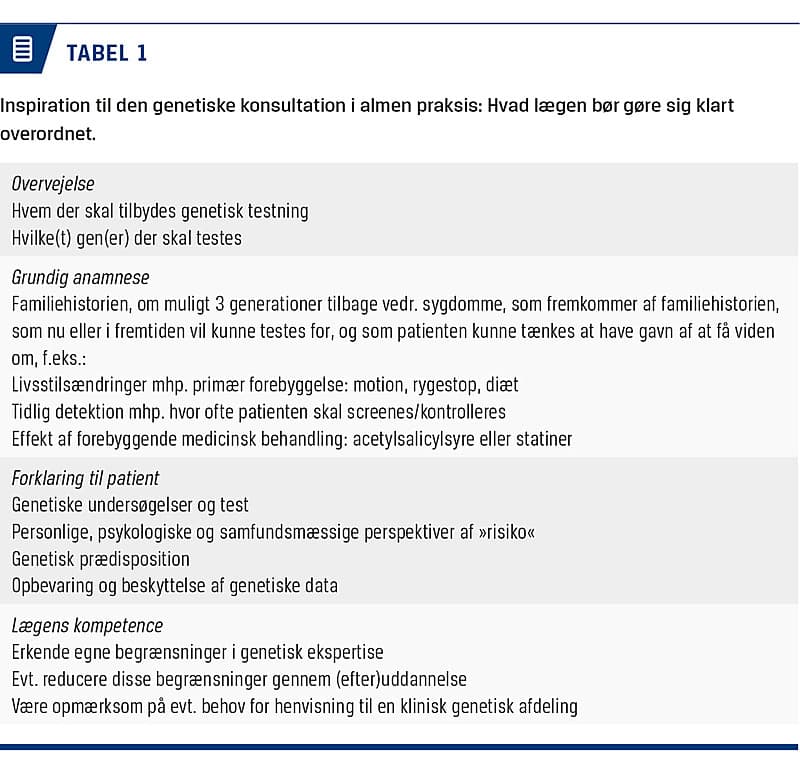Imens vi venter på forskningen og det uforløste potentiale, må vi håndtere henvendelser om genomisk medicin med udgangspunkt i den tilgængelige evidens, professionel lægefaglig vurdering og med tydelig kommunikation til patienten, så han eller hun bliver medinddraget i beslutningerne (Tabel 1). For nuværende er den bedste genetiske »test« for kroniske sygdomme formentlig det indblik i patientens familiehistorie, der fremkommer gennem en langvarig kontinuerlig læge-patient-kontakt.