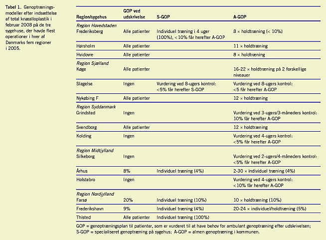 Rundspørgen viste, at patienterne på samtlige sygehuse i Danmark instrueres i et hjemmeøvelsesprogram, og at der tilbydes ambulant genoptræning efter mange forskellige modeller efter udskrivelse fra sygehuset (Tabel 1 ). Der er en tendens til, at der på sygehusene i Region Hovedstaden, Sjælland og til dels i Syddanmark overvejende udarbejdes GOP til alle patienter til almen ambulant genoptræning i kommunerne direkte efter udskrivelse, hvorimod der i Region Midtjylland og Nordjylland enten kun udarbejdes GOP til 8-20% af patienterne - fordelt lige mellem specialiseret og almen ambulant GOP - eller slet ikke udarbejdes GOP. Disse fem sygehuse vurderer, at der ikke er behov for ambulant genoptræning direkte i forbindelse med udskrivelsen, og de tilbyder alle efterfølgende ambulante kontroller mellem tre og 12 uger postoperativt. Her vurderes, om der er behov for genoptræning, hvilket der er for 5-10% af patienterne.