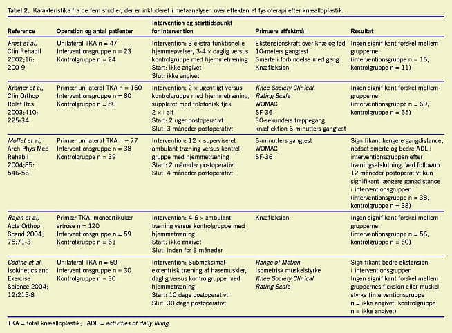 I en nylig metaanalyse af randomiserede, kontrollerede studier (RCT) ved TKA [5] analyserede man effekten af fysioterapi i form af aktiv træning/øvelsesprogrammer, der blev givet ambulant efter udskrivelse fra sygehus. To studiedesign blev inkluderet i analysen: Et, som indeholdt en kontrolgruppe, hvor patienterne skulle fortsætte med de hjemmeøvelser, som de var instrueret i under indlæggelsen kontra en interventionsgruppe, som modtog ambulant fysioterapeutisk øvelsesterapi, og et andet design, som sammenlignede to forskellige slags fysioterapeutisk øvelsesterapi efter udskrivelse. Effektmålene bestod af test af knæbevægelighed, muskelstyrke, gangfunktion, activities of daily living og selvrapporteret livskvalitetsvurdering eller helbredsvurderinger. Seks artikler havde kvalitet til at indgå i det systematiske review, hvoraf kun fem kunne indgå i metaanalysen. Disse fem anvendte samme studiedesign med en kontrolgruppe, som fortsatte med hjemmeøvelser kontra en interventionsgruppe, som trænede med supplerende funktionelle øvelser (Tabel 2 ). Interventionerne startede mellem ti dage og to måneder efter udskrivelsen, varede mellem tre uger og tre måneder og bestod af et varierende antal funktionelle, vægtbærende øvelser. Kontrolgrupperne fik ingen supplerende ambulant træning. Alle undersøgelser var gennemført med traditionel perioperativ behandling uden et »accelereret regi«. Resultatet af meta-analysen viste, at der 3-4 måneder postoperativt kun var en lille til moderat virkning på knæbevægelighed, gangfunktion og livskvalitet i gruppen, der modtog funktionelle øvelser, og at der et år postoperativt ingen forskel var mellem grupperne.